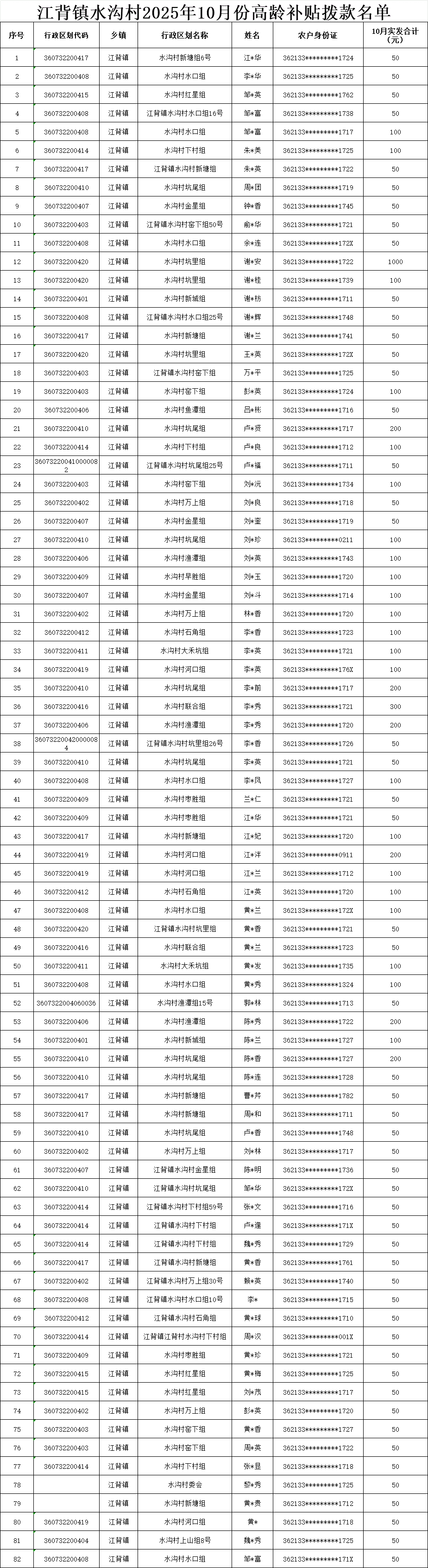 【養老服務】江背鎮水溝村2025年10月份高齡補貼撥款名單