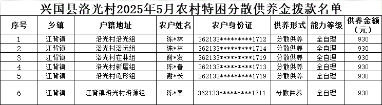 【社會救助】興國縣洛光村2025年5月農村特困分散供養金撥款名單