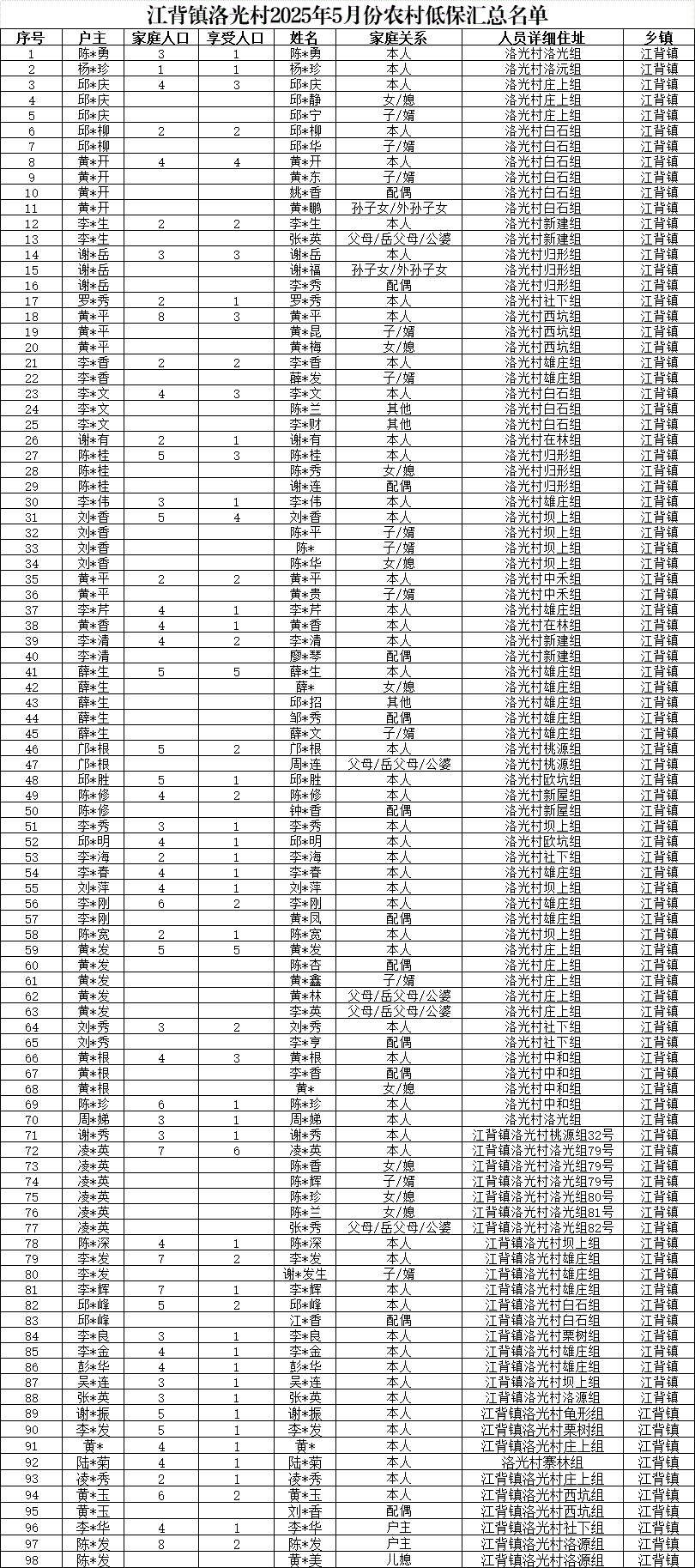 【社會救助】江背鎮洛光村2025年5月份農村低保匯總名單