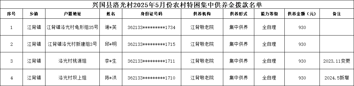 【社會(huì)救助】興國縣洛光村2025年5月份農(nóng)村特困集中供養(yǎng)金撥款名單