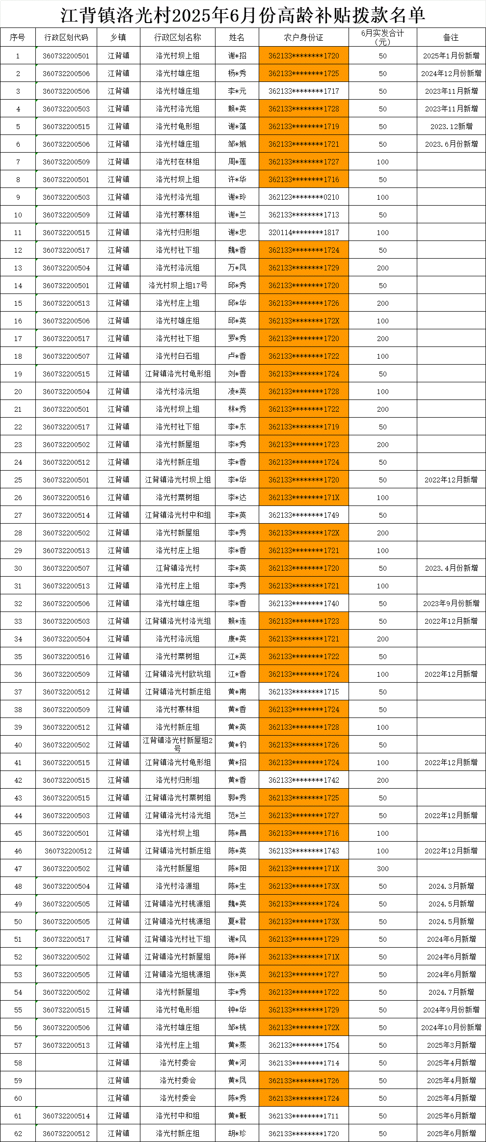 【養(yǎng)老服務(wù)】江背鎮(zhèn)洛光村2025年6月份高齡補(bǔ)貼撥款名單