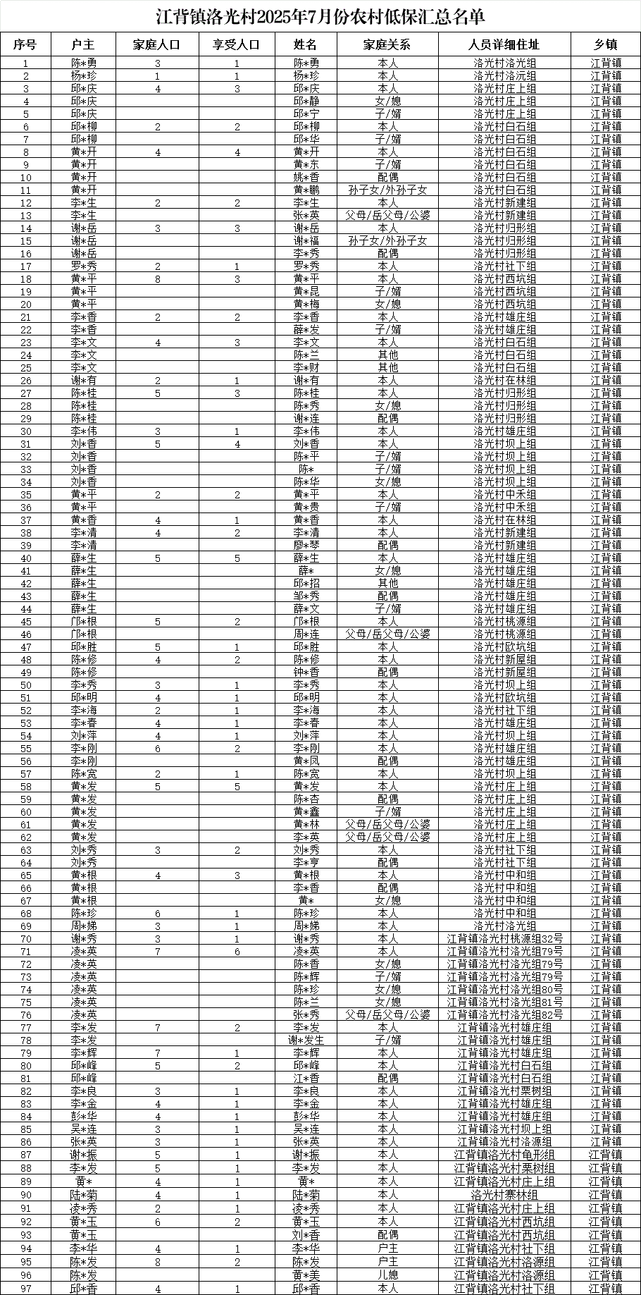 【社會救助】江背鎮(zhèn)洛光村2025年7月份農(nóng)村低保匯總名單