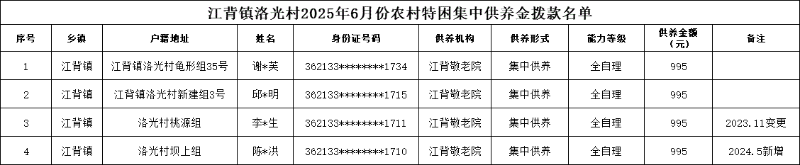 【社會救助】江背鎮洛光村2025年6月份農村特困集中供養金撥款名單