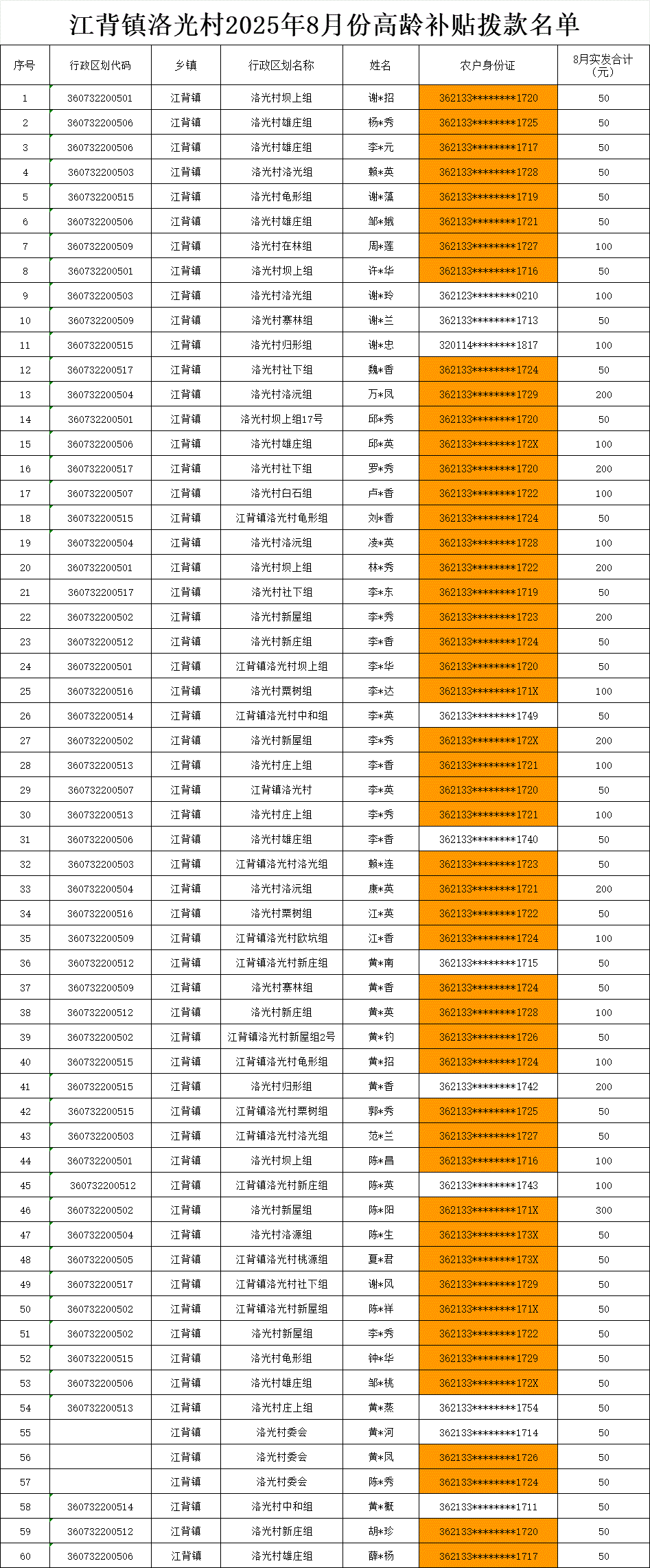 【養老服務】江背鎮洛光村2025年8月份高齡補貼撥款名單
