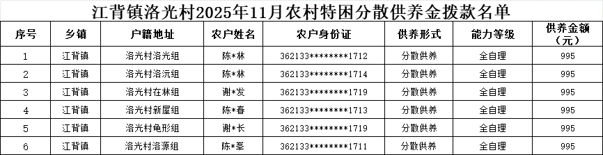 【社會救助】江背鎮洛光村2025年11月農村特困分散供養金撥款名單