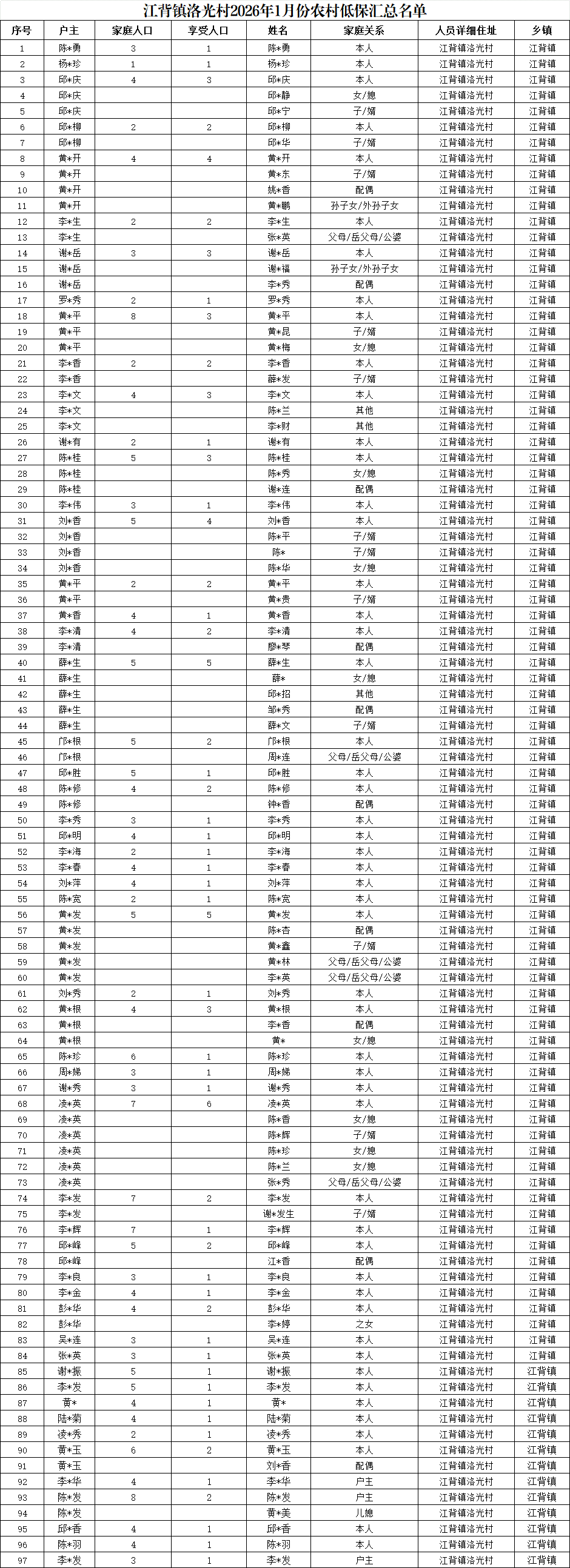 【社會救助】江背鎮洛光村2026年1月份農村低保匯總名單