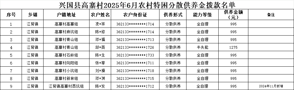 【社會(huì)救助】興國縣高寨村2025年6月農(nóng)村特困分散供養(yǎng)金撥款名單