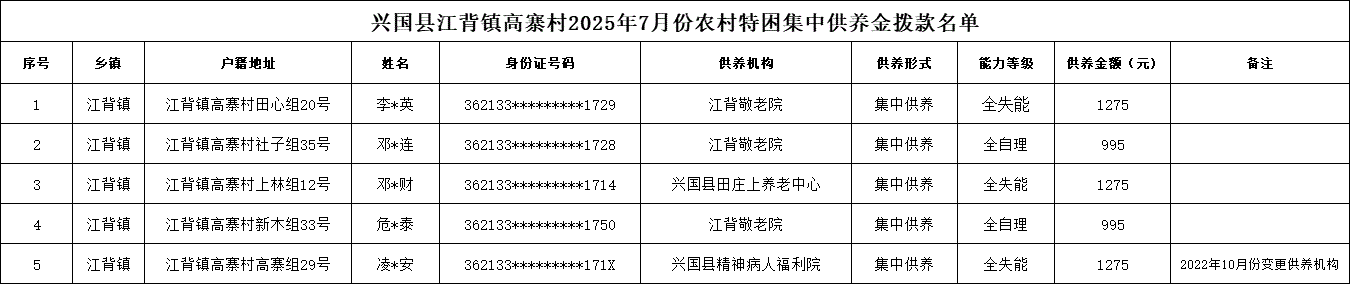 【社會救助】興國縣江背鎮(zhèn)高寨村2025年7月份農(nóng)村特困集中供養(yǎng)金撥款名單