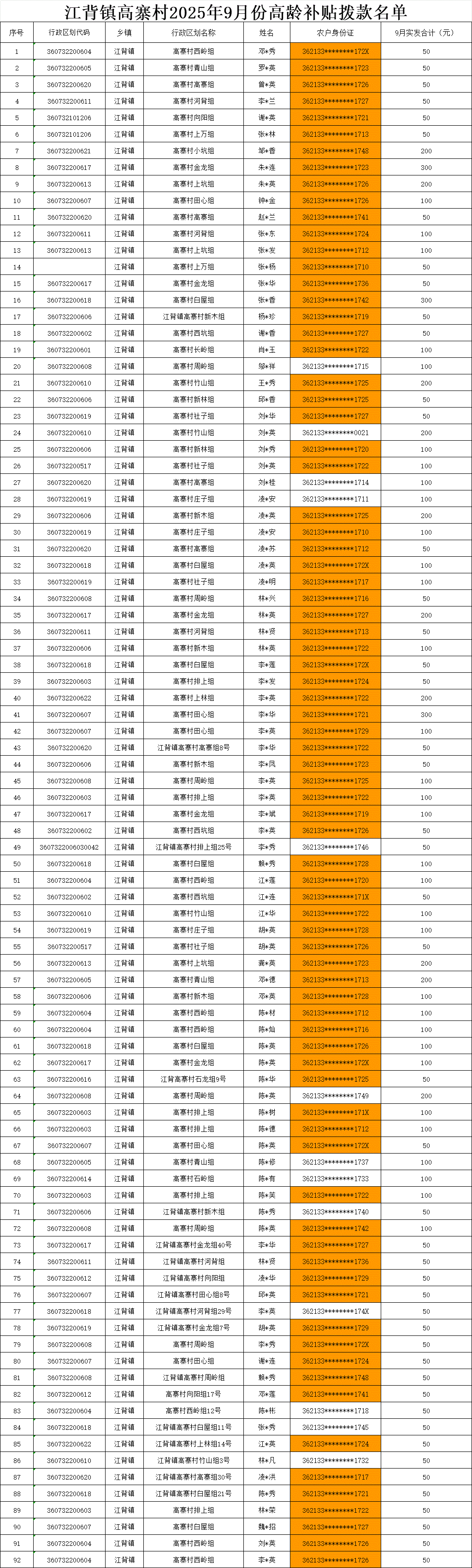 【養老服務】江背鎮高寨村2025年9月份高齡補貼撥款名單