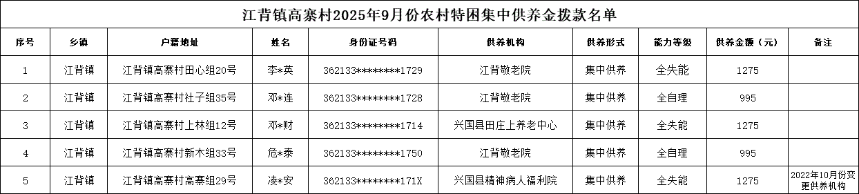 【社會救助】江背鎮(zhèn)高寨村2025年9月份農(nóng)村特困集中供養(yǎng)金撥款名單