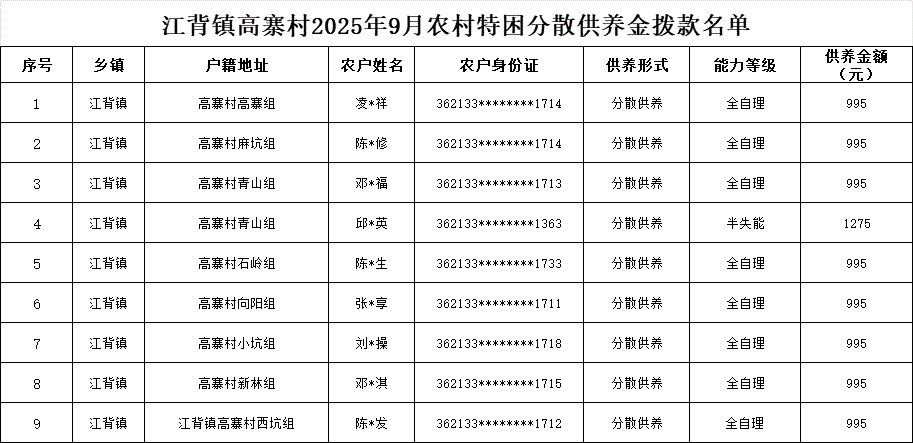 【社會(huì)救助】江背鎮(zhèn)高寨村2025年9月農(nóng)村特困分散供養(yǎng)金撥款名單