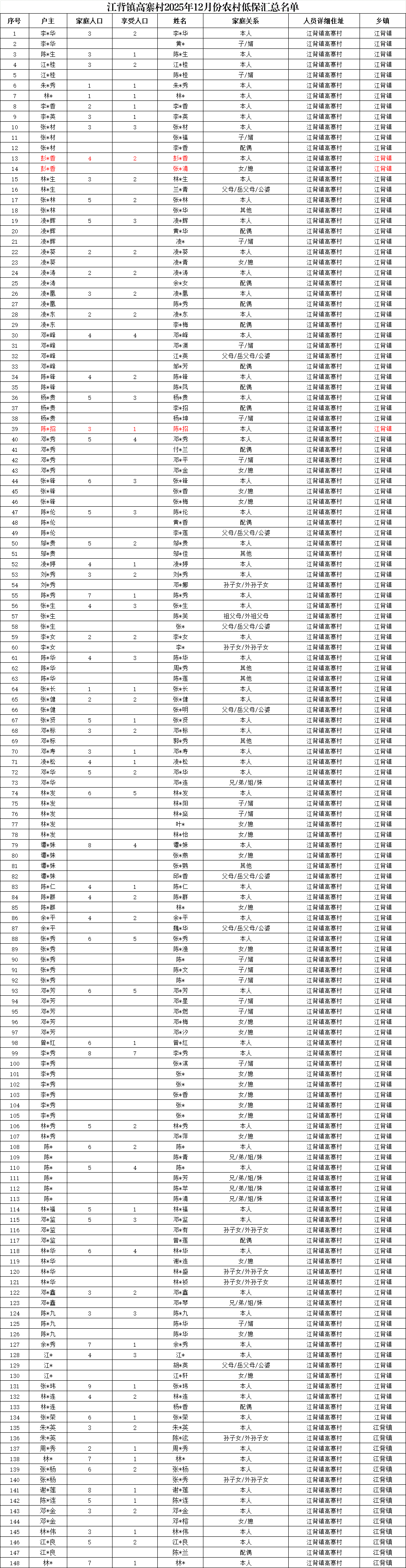 【社會救助】江背鎮(zhèn)高寨村2025年12月份農(nóng)村低保匯總名單