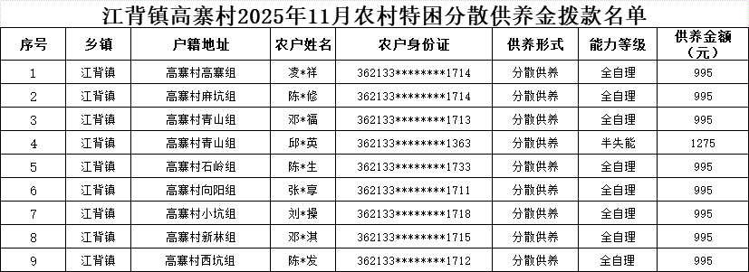 【社會(huì)救助】江背鎮(zhèn)高寨村2025年11月農(nóng)村特困分散供養(yǎng)金撥款名單