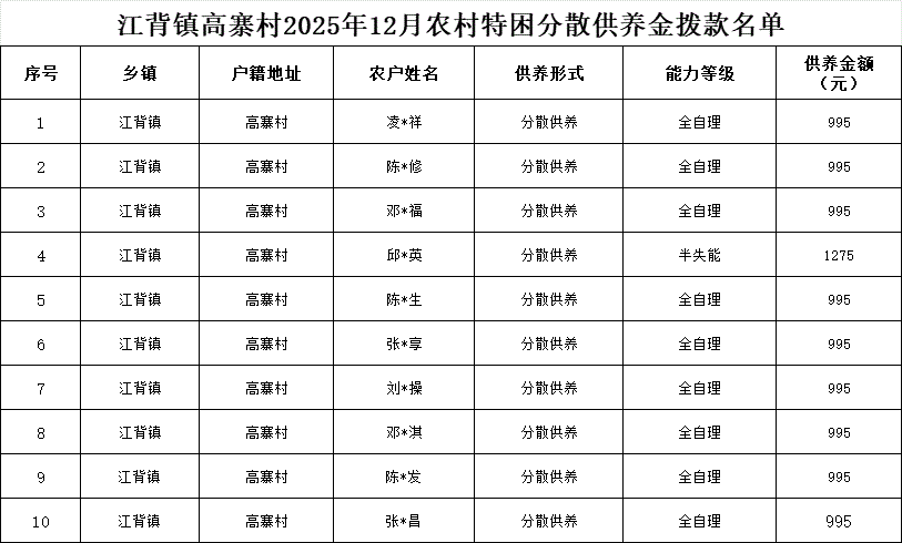 【社會救助】江背鎮高寨村2025年12月農村特困分散供養金撥款名單