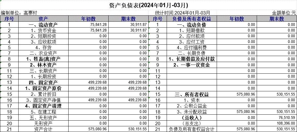 【財(cái)務(wù)收支】高寨村2024年第一季度資產(chǎn)負(fù)債表公示
