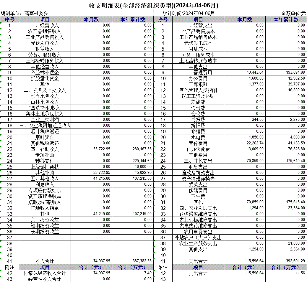 【財務收支】高寨村2024年第二季度收支明細表公示