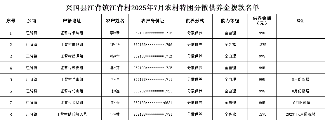 【社會救助】興國縣江背鎮(zhèn)江背村2025年7月農(nóng)村特困分散供養(yǎng)金撥款名單