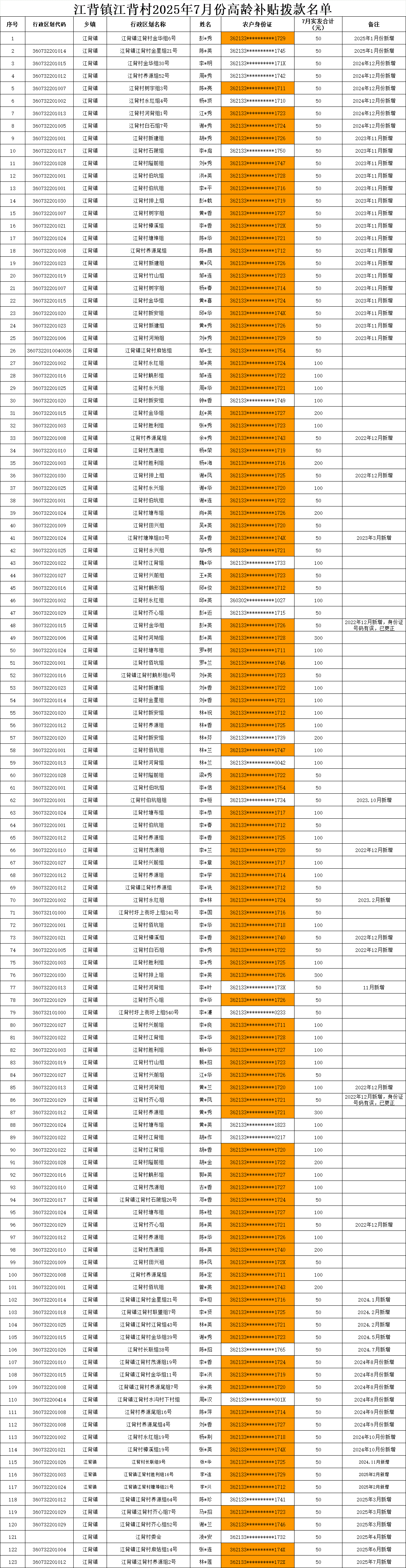 【養老服務】江背鎮江背村2025年7月份高齡補貼撥款名單