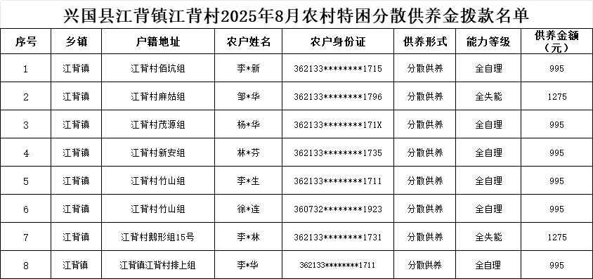 【社會救助】江背鎮江背村2025年8月農村特困分散供養金撥款名單