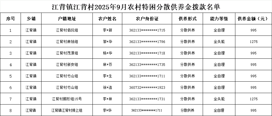 【社會(huì)救助】江背鎮(zhèn)江背村2025年9月農(nóng)村特困分散供養(yǎng)金撥款名單