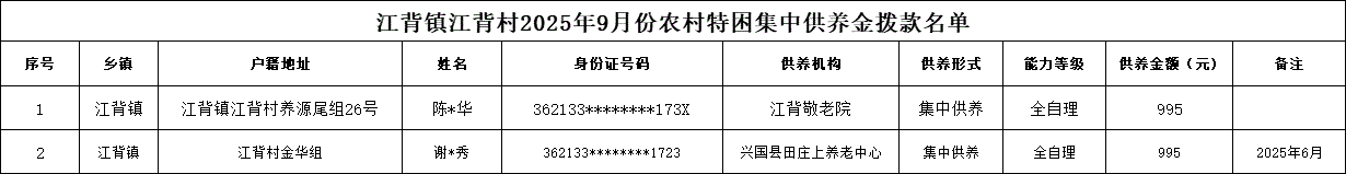 【社會(huì)救助】江背鎮(zhèn)江背村2025年9月份農(nóng)村特困集中供養(yǎng)金撥款名單