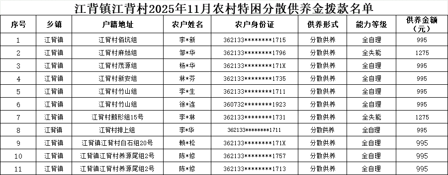 【社會救助】江背鎮江背村2025年11月農村特困分散供養金撥款名單