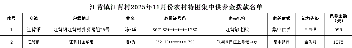 【社會救助】江背鎮(zhèn)江背村2025年11月份農(nóng)村特困集中供養(yǎng)金撥款名單