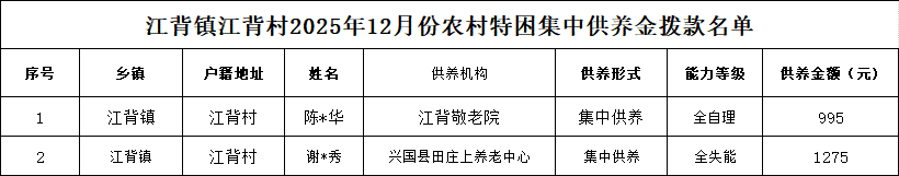 【社會救助】江背鎮(zhèn)江背村2025年12月份農(nóng)村特困集中供養(yǎng)金撥款名單
