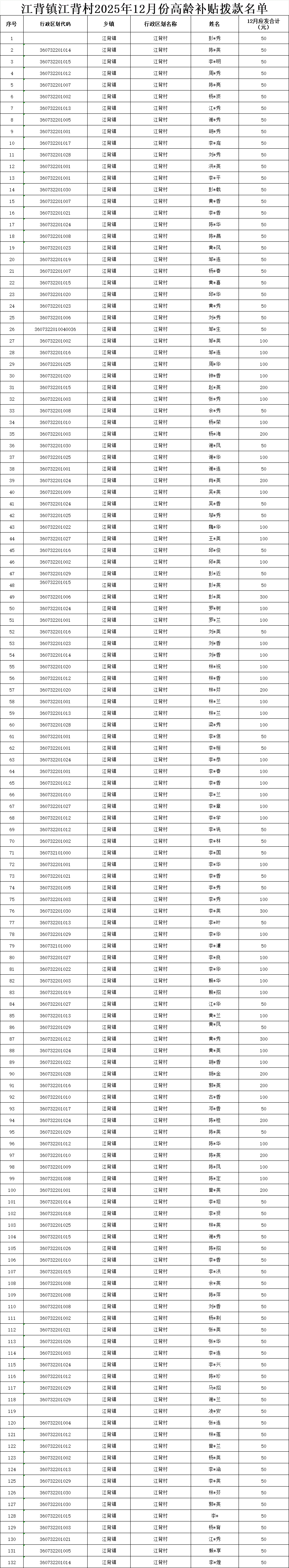 【養(yǎng)老服務(wù)】江背鎮(zhèn)江背村2025年12月份高齡補(bǔ)貼撥款名單