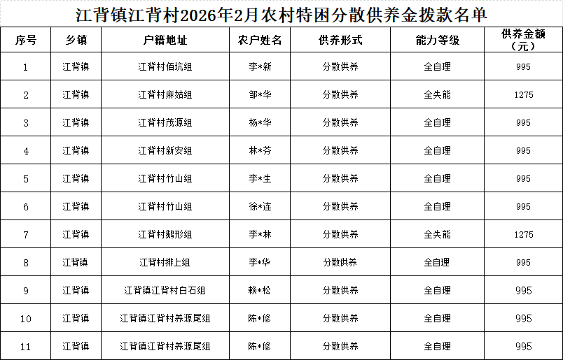 【社會救助】江背鎮江背村2026年2月農村特困分散供養金撥款名單