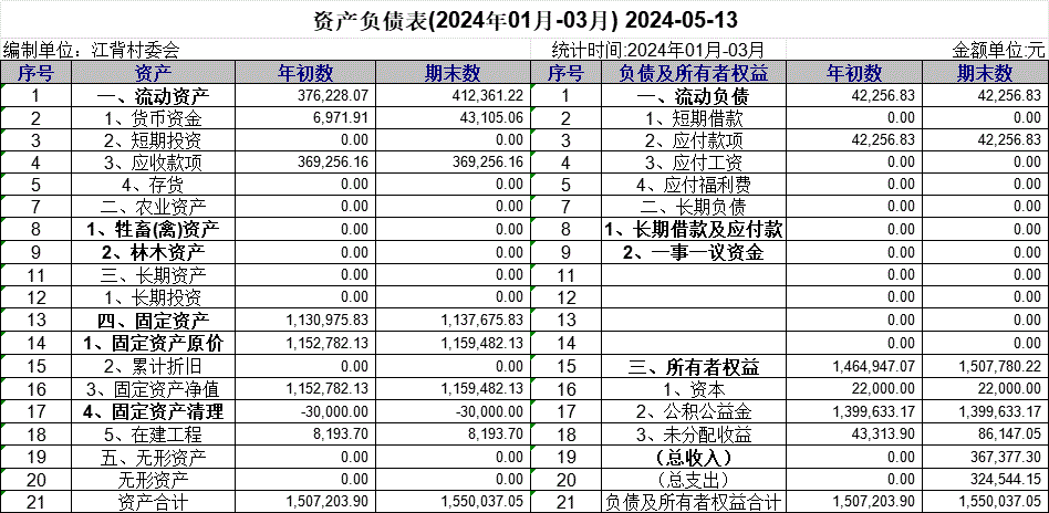 【財(cái)務(wù)收支】江背村2024年第一季度資產(chǎn)負(fù)債表公示