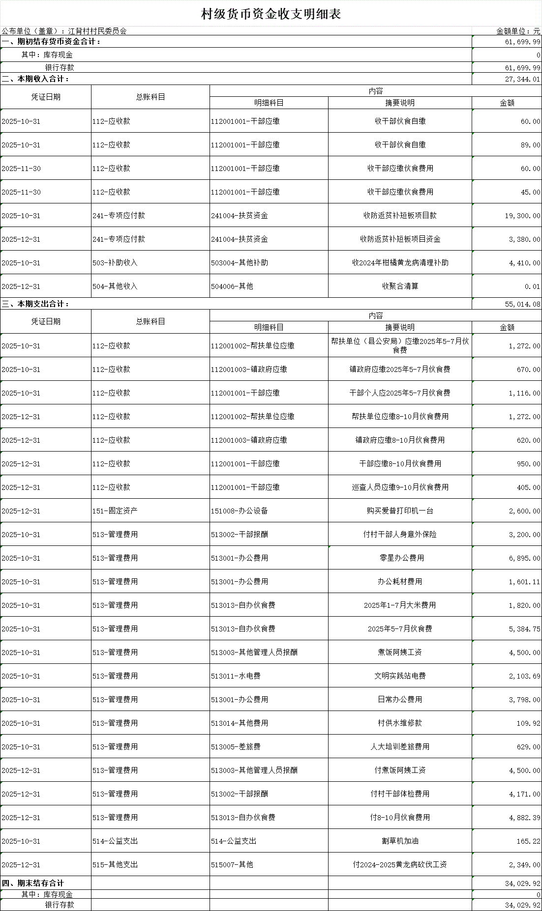 【財務收支】江背村2025年第四季度收支明細表公示