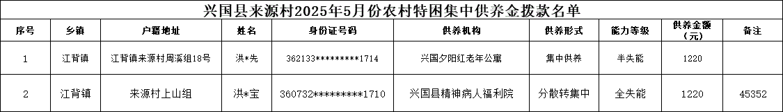 【社會救助】興國縣來源村2025年5月份農村特困集中供養金撥款名單