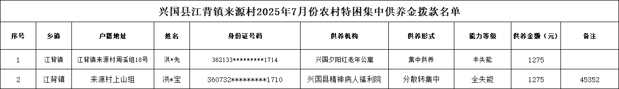 【社會救助】興國縣江背鎮來源村2025年7月份農村特困集中供養金撥款名單