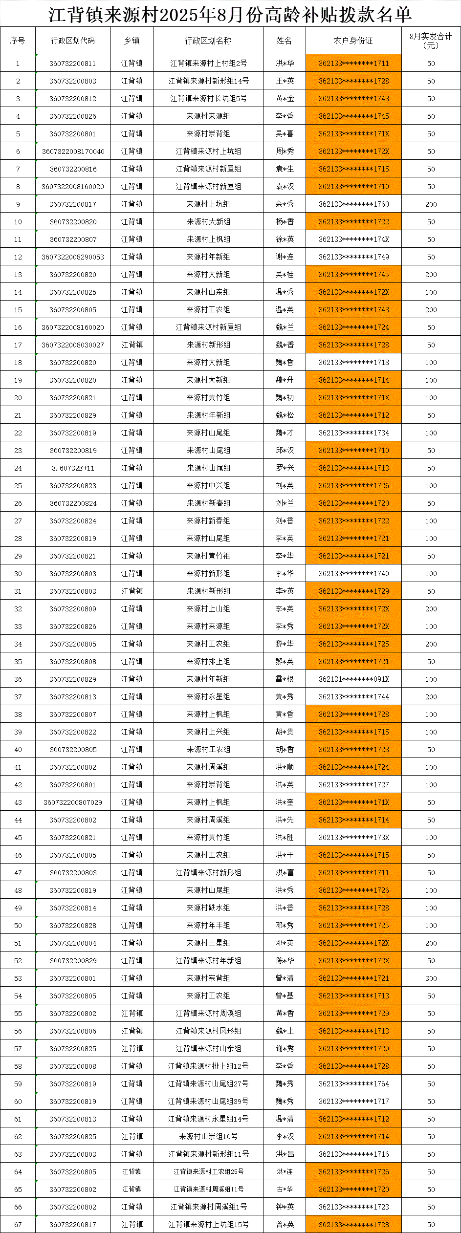 【養老服務】江背鎮來源村2025年8月份高齡補貼撥款名單