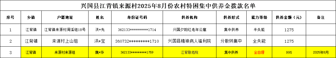 【社會救助】江背鎮來源村2025年8月份農村特困集中供養金撥款名單