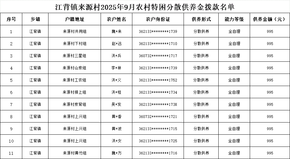 【社會救助】江背鎮來源村2025年9月農村特困分散供養金撥款名單