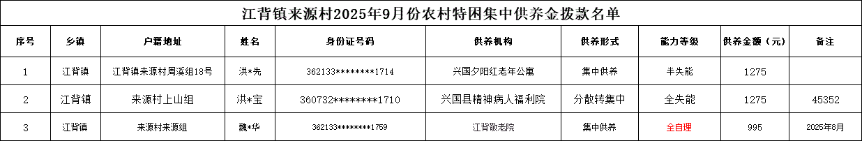 【社會救助】江背鎮來源村2025年9月份農村特困集中供養金撥款名單