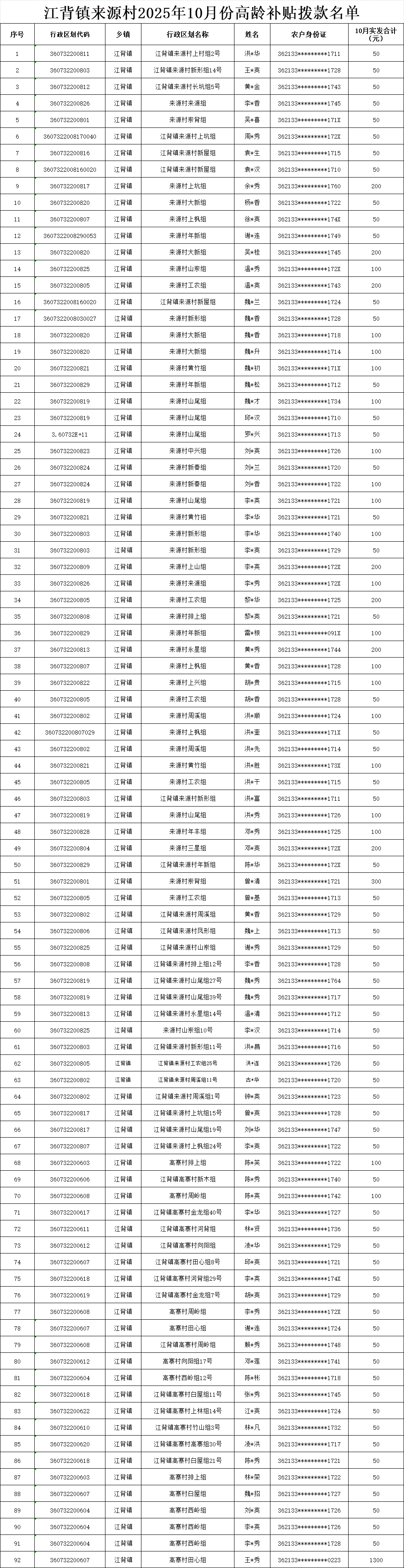 【養老服務】江背鎮來源村2025年10月份高齡補貼撥款名單