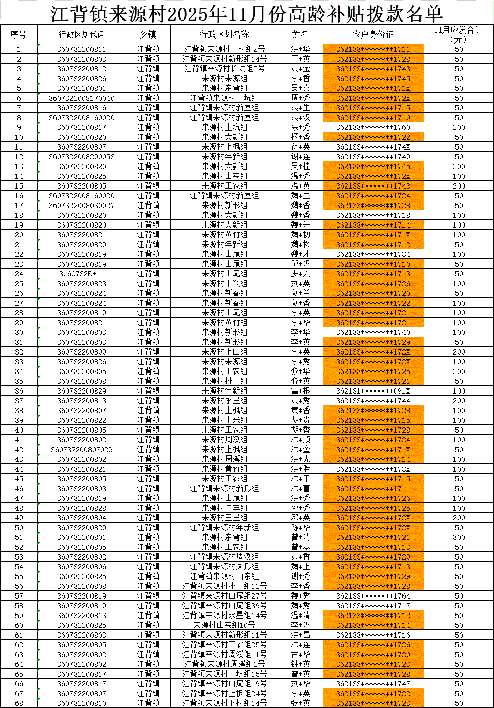 【養老服務】江背鎮來源村2025年11月份高齡補貼撥款名單