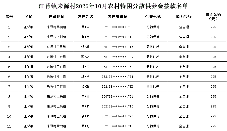 【社會救助】江背鎮來源村2025年10月農村特困分散供養金撥款名單