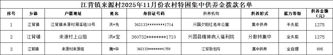 【社會救助】江背鎮(zhèn)來源村2025年11月份農(nóng)村特困集中供養(yǎng)金撥款名單