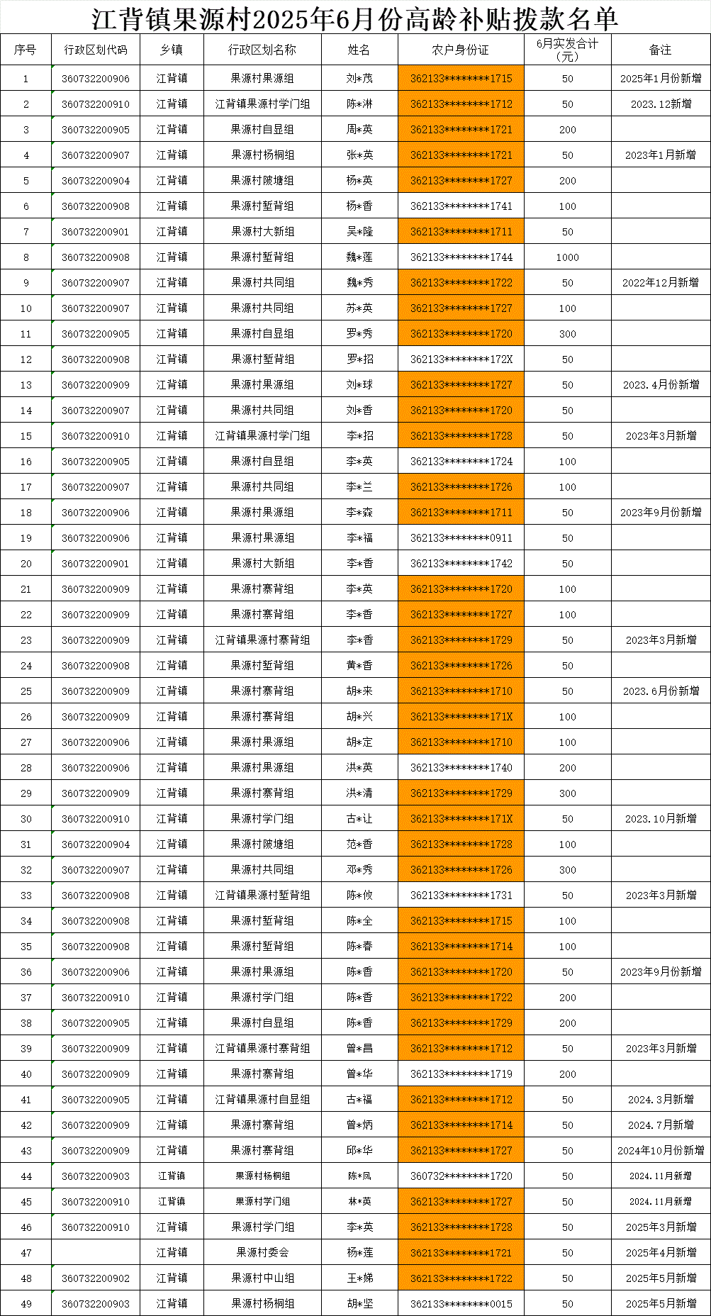 【養(yǎng)老服務(wù)】江背鎮(zhèn)果源村2025年6月份高齡補(bǔ)貼撥款名單