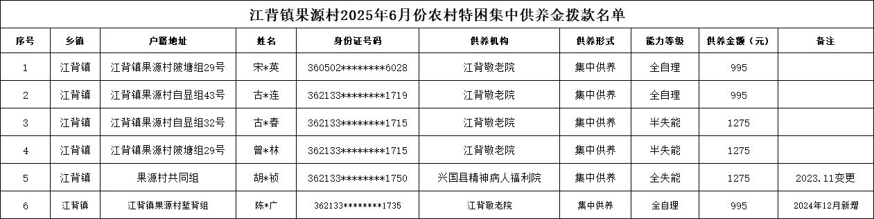 【社會救助】江背鎮果源村2025年6月份農村特困集中供養金撥款名單