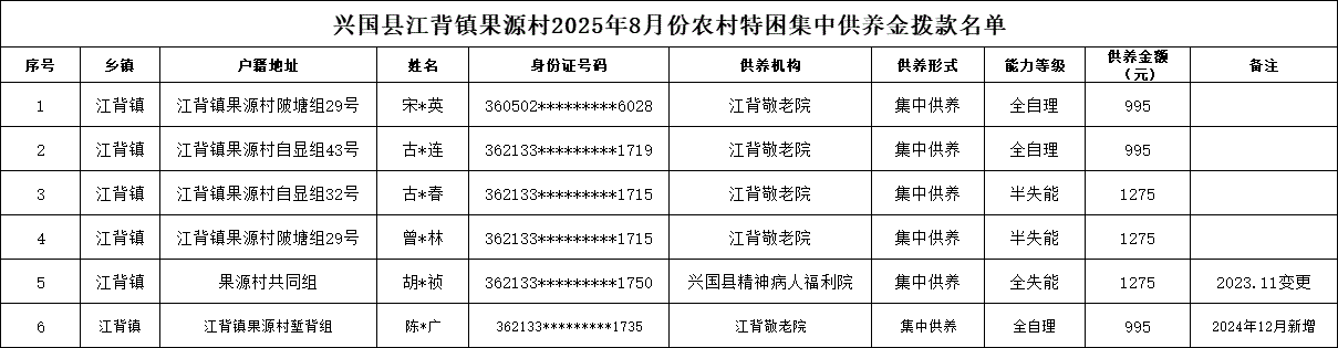 【社會救助】江背鎮果源村2025年8月份農村特困集中供養金撥款名單