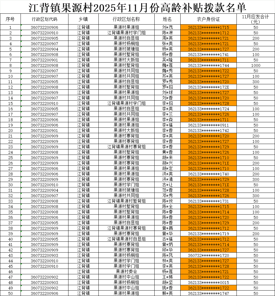 【養老服務】江背鎮果源村2025年11月份高齡補貼撥款名單