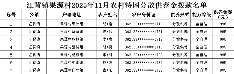 【社會救助】江背鎮果源村2025年11月農村特困分散供養金撥款名單