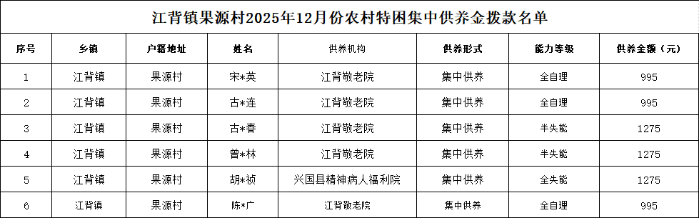 【社會救助】江背鎮果源村2025年12月份農村特困集中供養金撥款名單