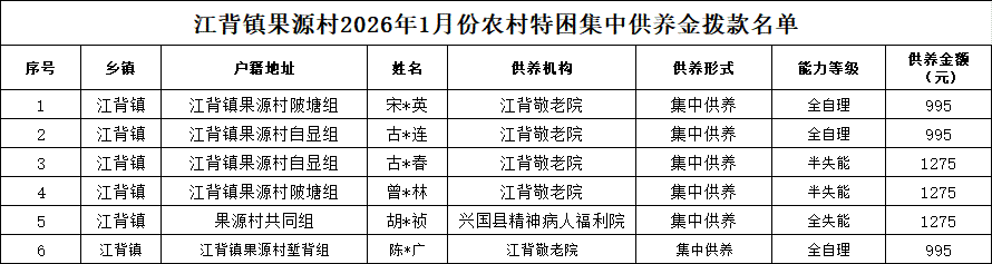 【社會救助】江背鎮果源村2026年1月份農村特困集中供養金撥款名單