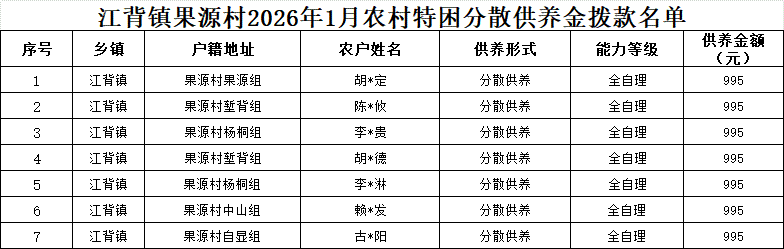 【社會救助】江背鎮果源村2026年1月農村特困分散供養金撥款名單